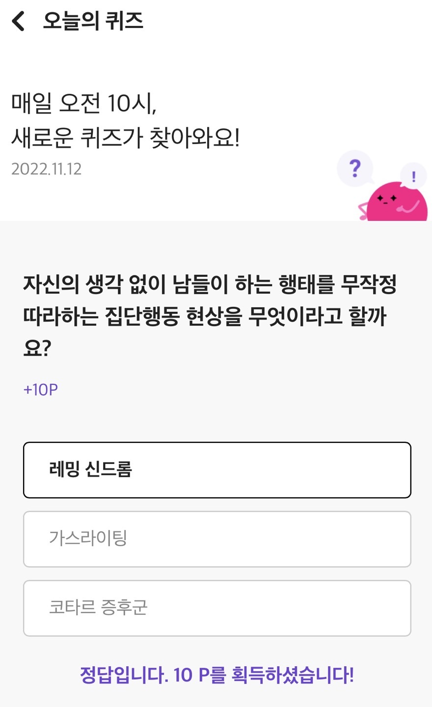 | [정보공유] 캐시워크 돈버는퀴즈 정답 11월 10일 17시 30분 기준 (0) | 2022.11.10 |