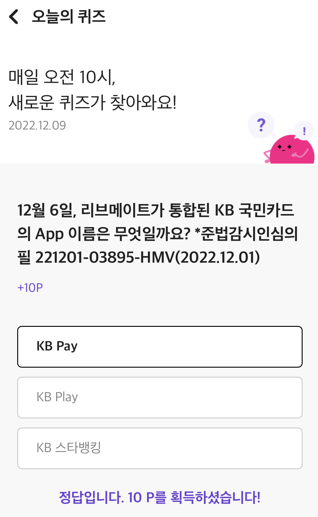 | 12월 10일 리브메이트(KBpay)/캐시워크 정답 (18시 기준) (2) | 2022.12.10 |